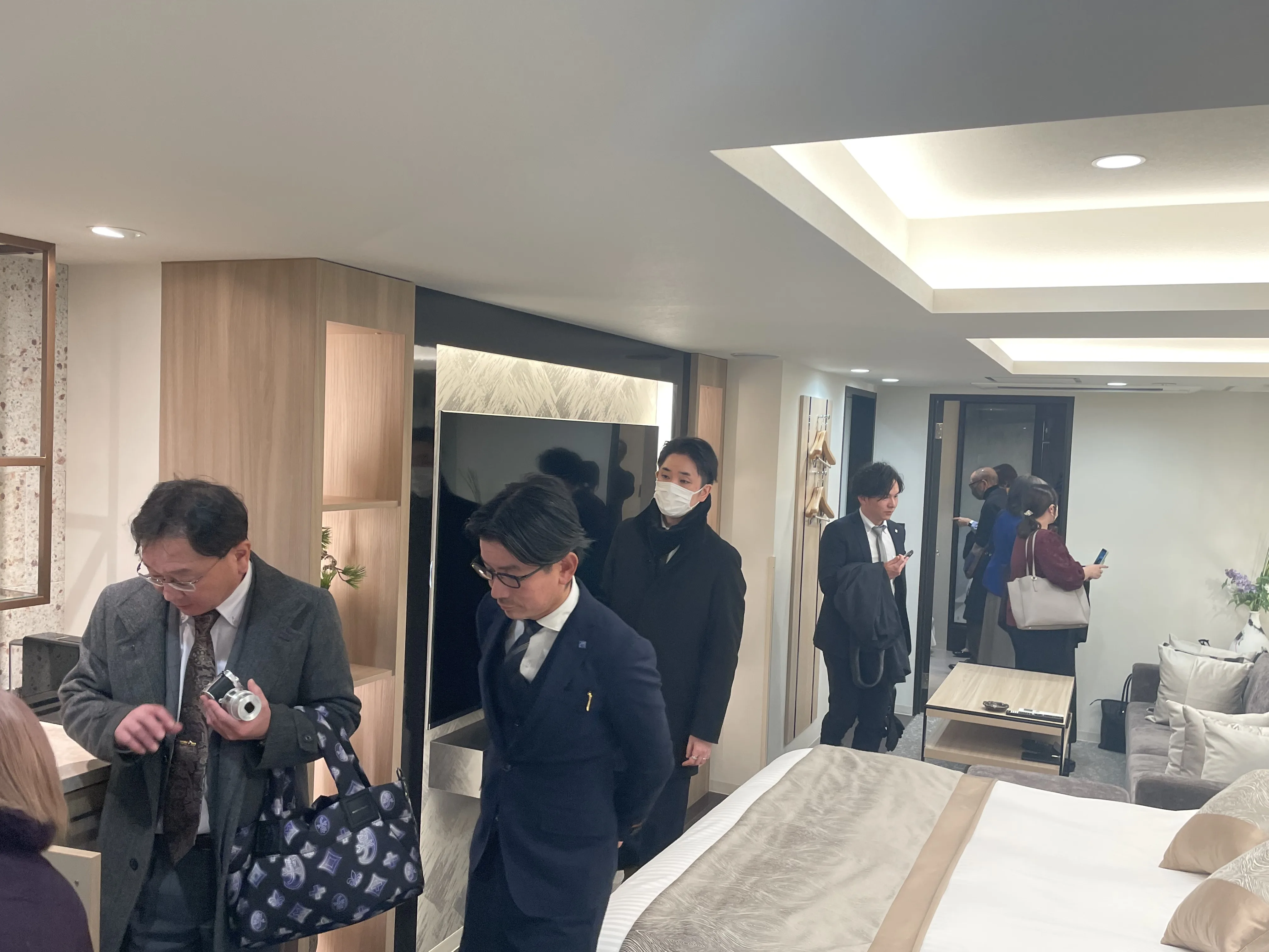 外観はスタイリッシュで高級感のある和テイストの佇まいで、入館前から参加者の期待を高める雰囲気でした。また室内もデザイン、インテリア、アメニティに至るまで一つひとつにこだわりが詰まっており、洗練された空間に参加者からは学びや参考になる点が多かったとの声が寄せられ大変好評でした。年末の繁忙期にもかかわらず内覧にご協力いただきました HOTEL MINATO 様には、この場をお借りして深く御礼申し上げます。