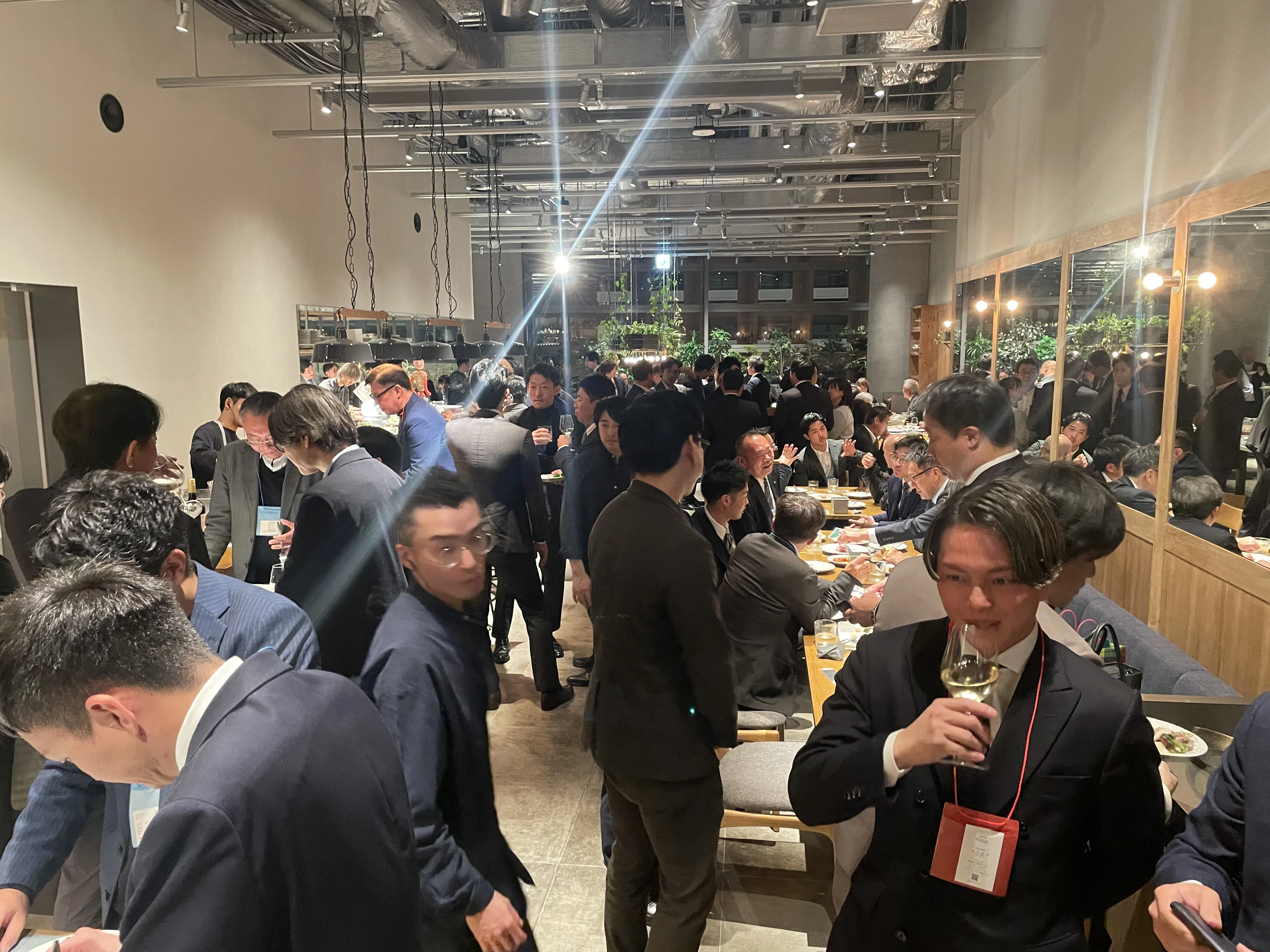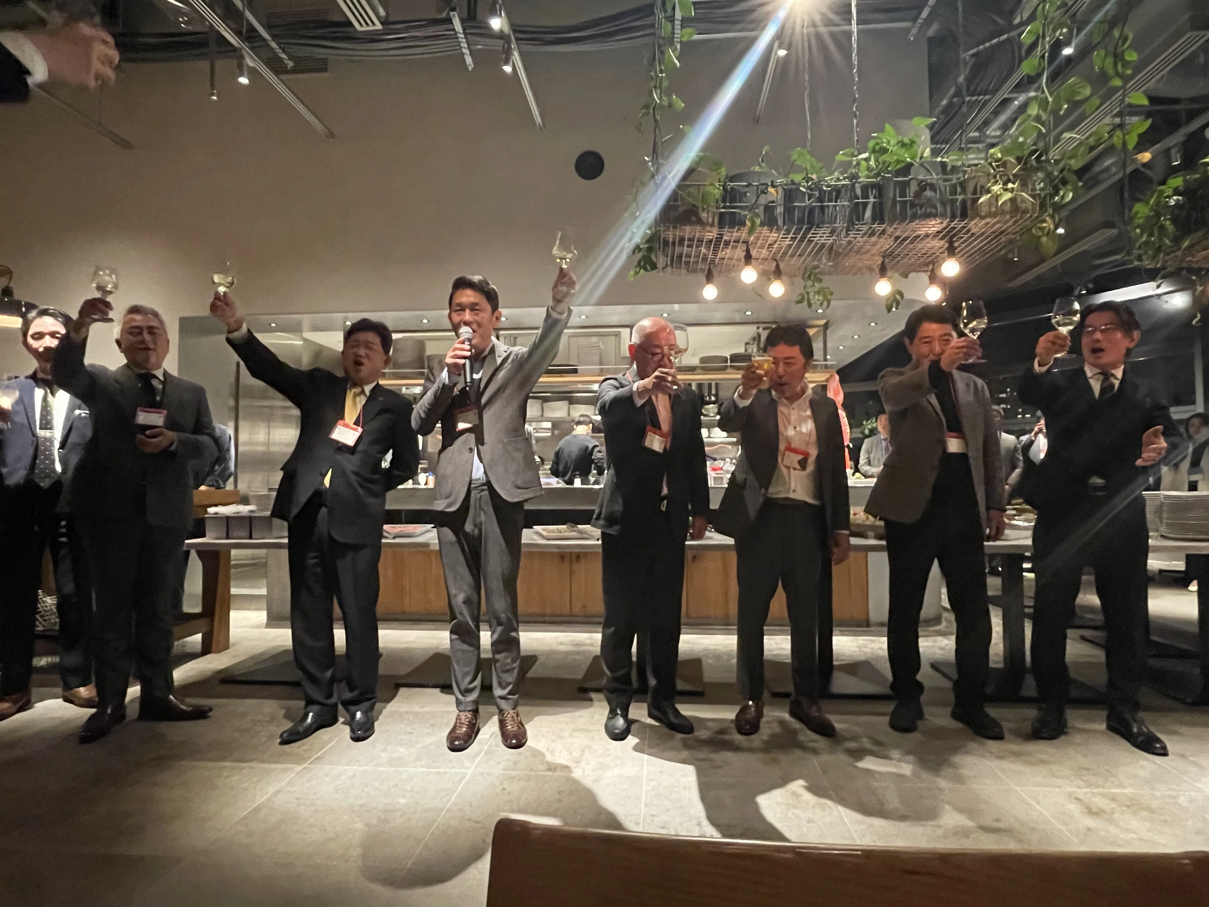 忘年会では、麻布台ヒルズタワープラザ内の「RACINES」に場所を移し、110名を超える会員様にご参加を頂きました。冒頭で内宮ブロック長よりご挨拶と事務局事務所の移転のご報告があり、併せて長年にわたり移転前事務所にご協力をいただいた株式会社Re・stay宮原社長へ謝辞が述べられました。また、会の途中では賛助会員の皆様のご紹介も行い、美味しい料理とお酒を楽しみながら今年一年を締めくくるのにふさわしい盛会となりました。会員同士の交流もより一層深まり、有意義な時間となった様子でした。ご参加頂いた皆様、有難うございました。
